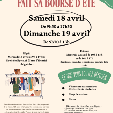 Vie associative Bourse d´été Lieu Centre social des 5 Bonniers Heure 9h30 – 13h00 Du 18 avril au 19 avril