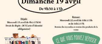 Dates de vente : Samedi 18 avril : 9h30 – 17h30 Dimanche 19 avril : 9h30 – 13h Dépôt des articles : Mercredi 15 avril : 9h – 17h30