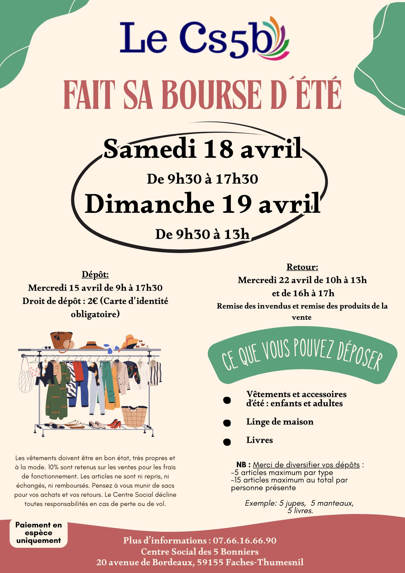 Conditions : Articles propres, en bon état et actuels 10 % du prix de vente sont retenus pour les frais d’organisation Maximum 5 articles par type Maximum 15 articles au total par personne Les articles ne sont ni repris, ni échangés, ni remboursés Paiement en espèces uniquement